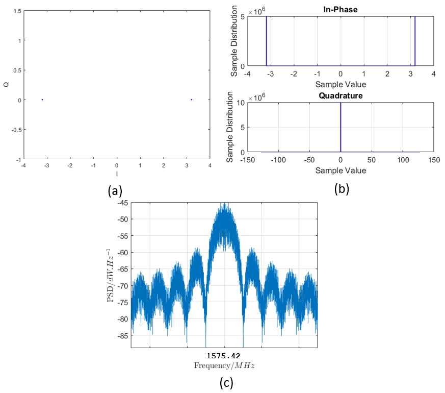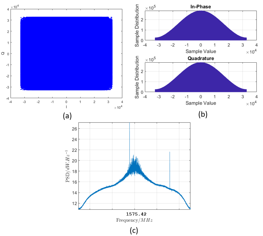 In figure 3c, the PSD of the IQ signals is shown. As can be observed, there is a main lobe at the centre frequency of 1575.42 MHz representing the base band signal (the navigation message).
