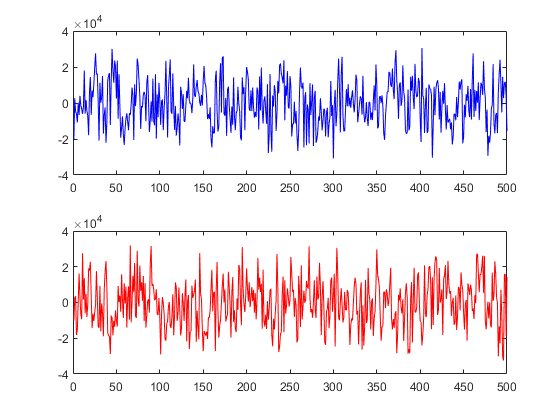 Figure 4 below shows the snapshot (500 samples) of real IQ signals received from a GPS satellite. As can be seen in figure 4 below, the I and Q channel only show noises instead of rectangular signal containing navigation messages (shown in figure 2). The sampling rate at the receiver is 10 MHz, meaning a total of 10 million IQ samples are captured every one second.