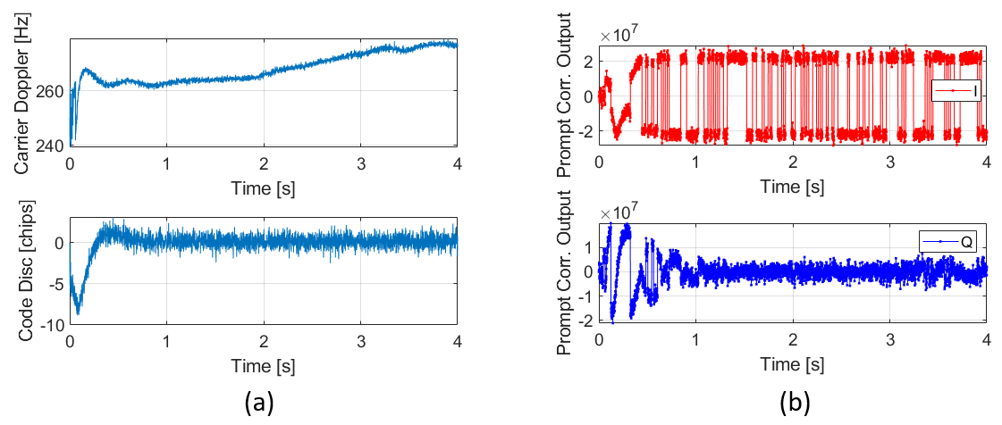 The points outside the two clusters in the tracked IQ constellation (figure 9 right) are due to the transient period of the tracking process before locking the carrier (Doppler) and code delay (shown in figure 7a).