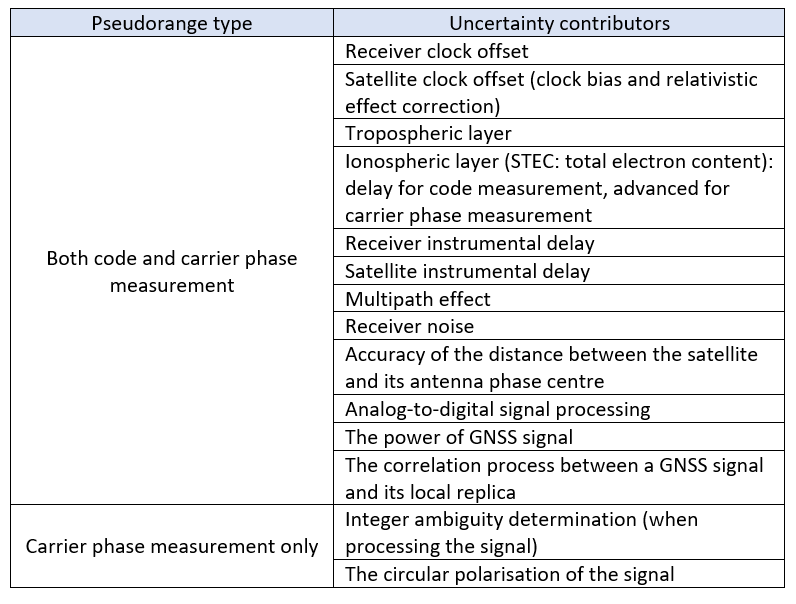 Finally, more detailed uncertainty contributors specifically that are relevant to pseudorange are summarised.