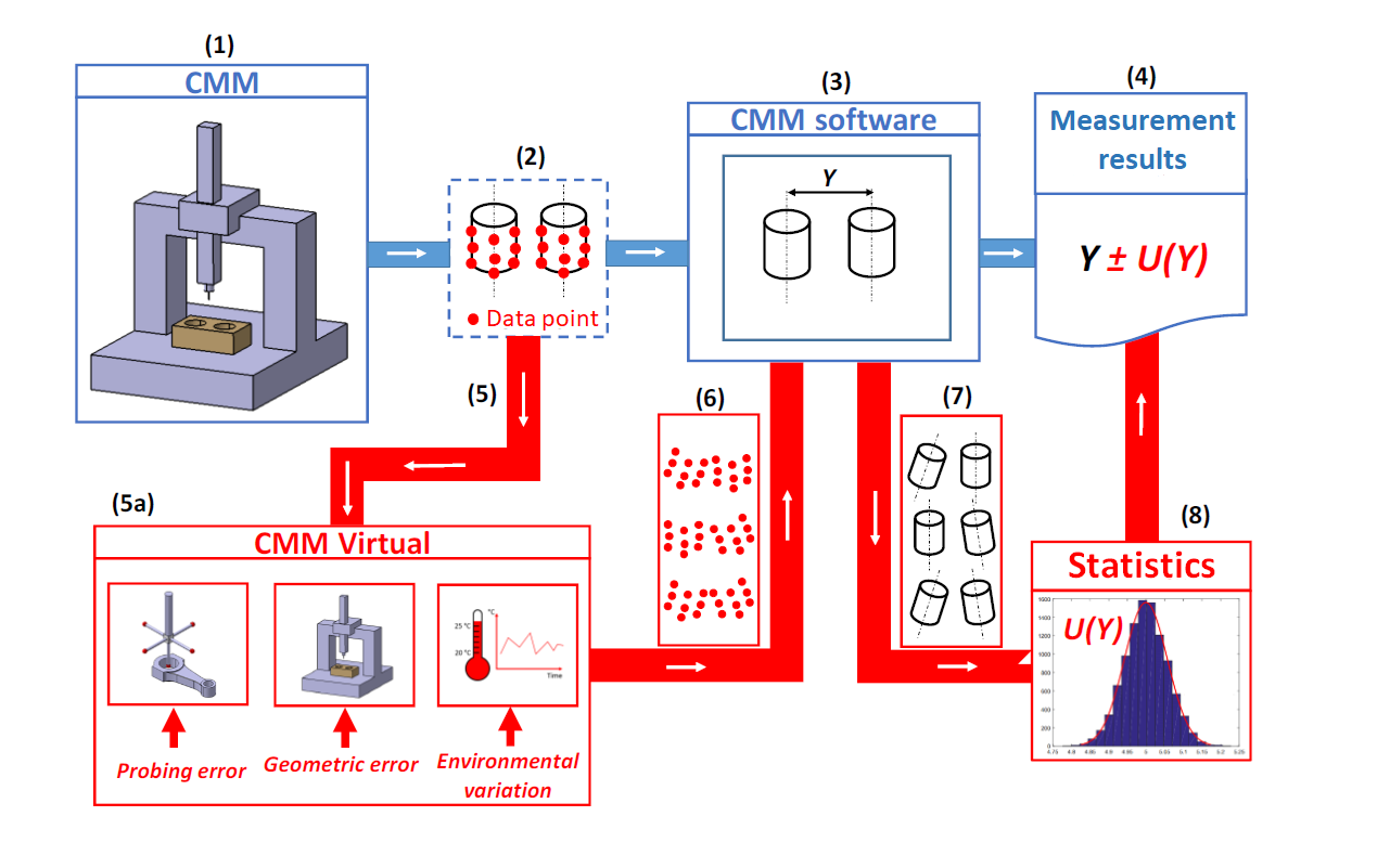 The “red” colour step is the MC simulation procedure. The simulation used the previously real captured points as the replacement of the mathematical model of the measurement. In the MC simulation, these points are then perturbed by adding noise to the point coordinates. The noise considers relevant uncertainty sources of the CMM measurements.