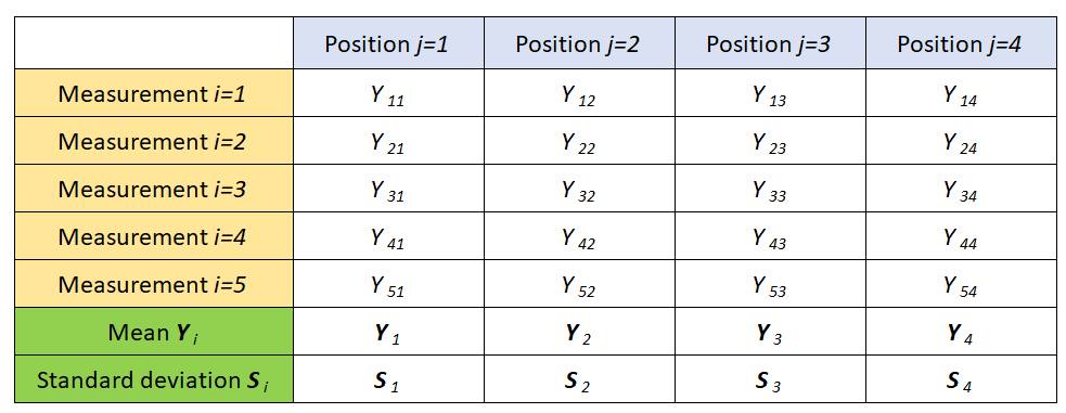 From figure 2 above, measurements are divided into four parts based on the orientation (location) of a measured part, that is $j-th$ orientation $\{j=1,2,3,4\}$. And, on each part orientation, five measurement repetitions are performed $\{i=1,2,3,4,5\}$.