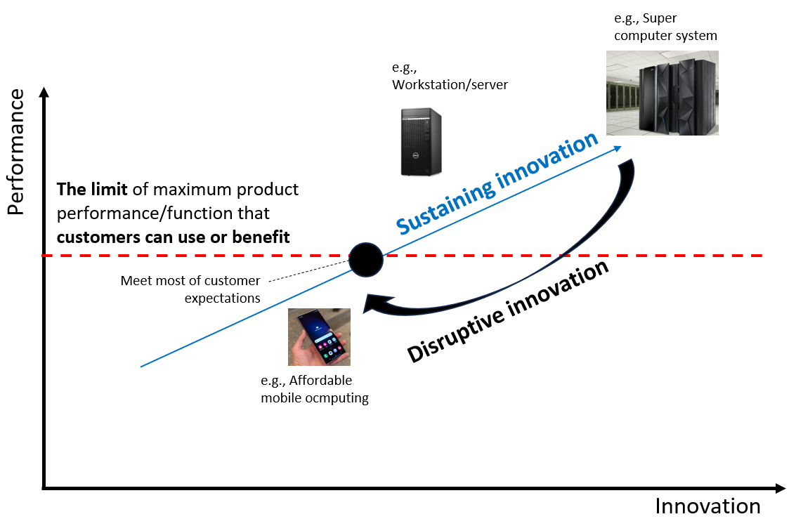In Figure 2, most improved products, obtained from sustaining innovation, exceed what most customers really need. For example, workstations or even mainframe computers are over-qualified for most computer users albeit these computers have a very high computing performance and memory capacity.
