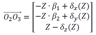 Where the angle $\alpha$ is the perpendicularity error between the X-axis and the Y-axis. Also when the Z-axis moves as many as Z, then the coordinate transformation from $O_{2}$ to $O_{3}$ is formulated as: