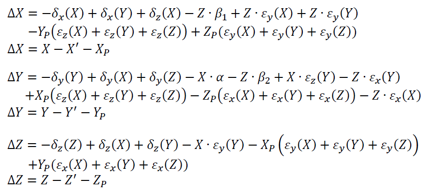 Where $\Delta X, \Delta Y, \Delta Z$ are the errors of a point $P$ in X,Y and Z direction. The value of $\Delta X, \Delta Y, \Delta Z$ are the errors that need to be compensated by the control system of the CMM for a commanded position.