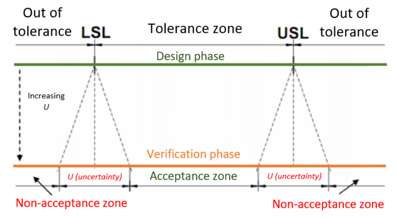To illustrate this tolerance zone reduction due to uncertainty, figure 1 below shows the rule for accepting part in inspection process. We can see from this figure that our measurement uncertainties should be considered when accepting inspected parts.