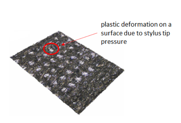 In this figure, the surface of a measured part has indented textures due to the Hertzian force of the tip of the stylus probe of a tactile CMM.