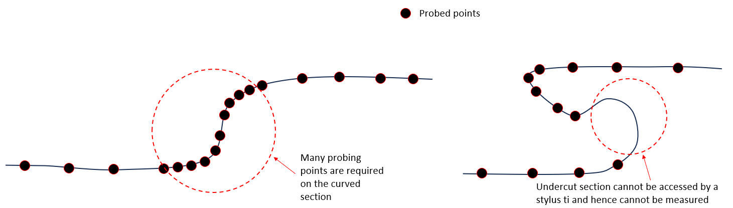 In addition to many points probed on the curved section, we need to consider how to access the curved section. The curved section may cause an “undercut” where the stylus of a tactile CMM cannot access the area and hence cannot sampled (probed) the points.