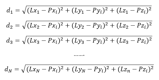 Where $x,y,z$ are the coordinates of a cooperative object whose position to be determined, $d_{i}$ is the distance between the object and the $i-th$ laser tracker and $x_{i}, y_{i}, z_{i}$ are the coordinates of the $i-th$ laser tracker with respect to the 1st tracker position as the reference.