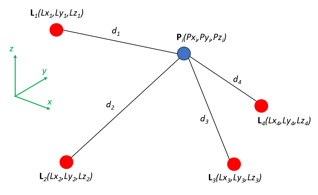 Figure 1 below shows general multilateration method. In this figure, the position of a subject P in $x,y,z$ coordinate system will be determined from the distance between P and other four transmitters or beacons with known positions.
