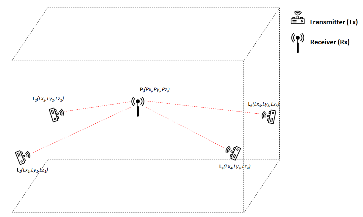 - Consist of N numbers of transmitter or beacon or signal source (with known positions) and a subject whose position to be determined.
