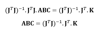 To solve for $A,B,C$, multiply both sides of the equation by (JTJ)-1 as follows: