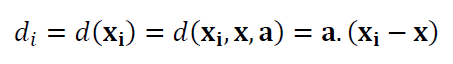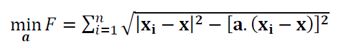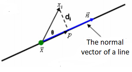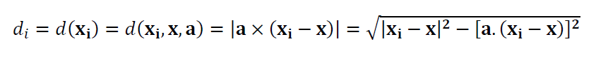 Where $d_{i}$ is the $i$-th residual or the orthogonal distance (see figure 1 above) of $i$-th point to the line geometry under fitting process. $\bf x$ = $(x,y,z)$ is a point on the line that is the centroid of all measured points on the line. $\bf a$=$(a,b,c)$ is the normal vector of the line, where |$\bf a $|$=1$.