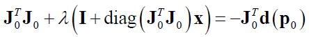 From the above complete mathematical equation (that is positive semi-definite [2]), it can be observed that when $\lambda$ has a small value, hence the LM algorithm behaves as Gauss-Newton method. Meanwhile, when $\lambda$ has a large value, hence the diagonal element of matrix $\bf J_{0}^{T} \bf J_{0}$ will be small and hence the LM algorithm behaves as steepest-descent method.