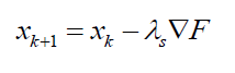 Where $ \nabla F=( \partial F/ \partial x, \partial F/ \partial y, \partial F/ \partial z)$ is the gradient of the objective function in hand and also the direction of the solution search in each iteration step. $\lambda _{s}$ is the size of the step describing how far the new candidate solution from the current candidate solution in each iteration step.