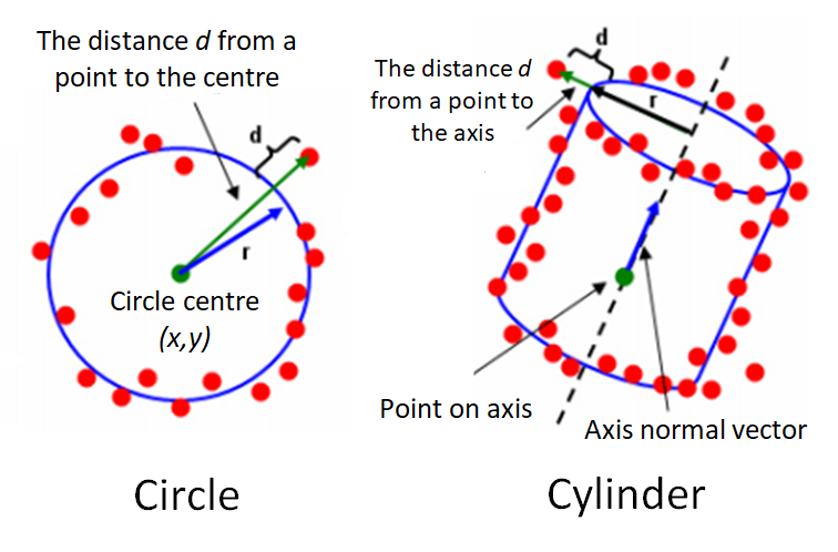 Figure 1 below shows the illustration of the residuals of a circle (representing 2D geometry) and cylinder (representing 3D geometry). In figure1, the residual is the orthogonal distance between a point to a nominal geometry.