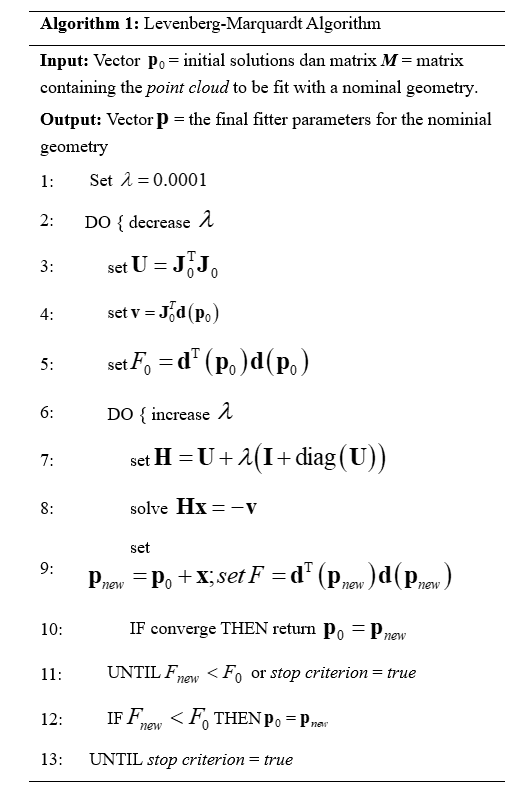 The implementation of LM algorithm proposed by Shakarji as NIST [1] is presented in Table 1 below.