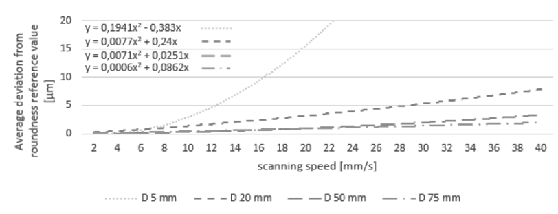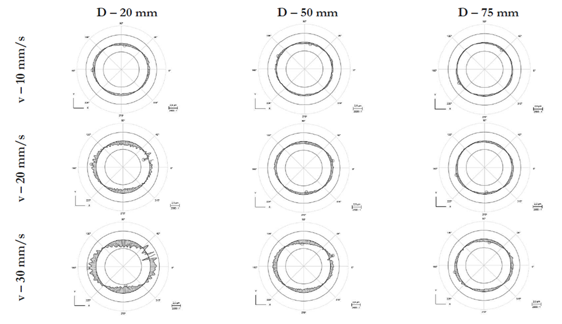 From figure 3, we can observe that the highest roundness deviation reading occur on the highest measurement speed (at 30mm/s) and for smallest part diameter (at 20mm).