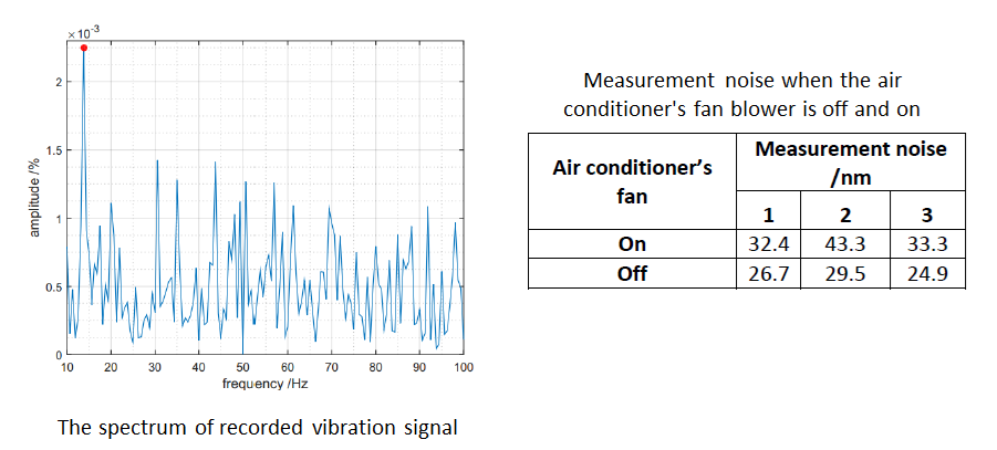 From figure 5, the vibration from the AC fan blower has approximately 15Hz frequency. This vibration causes an increase in measurement noise for about up to 9.3nm in average, from 27.03nm to 36.6nm, when the AC is on.