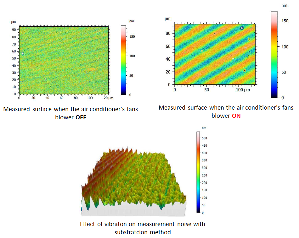 In addition, when the AC is on and vibration is significant, the subtracted data points from two surfaces to estimate measurement noise is significantly deteriorated and cause non-stationary effect on the data points.