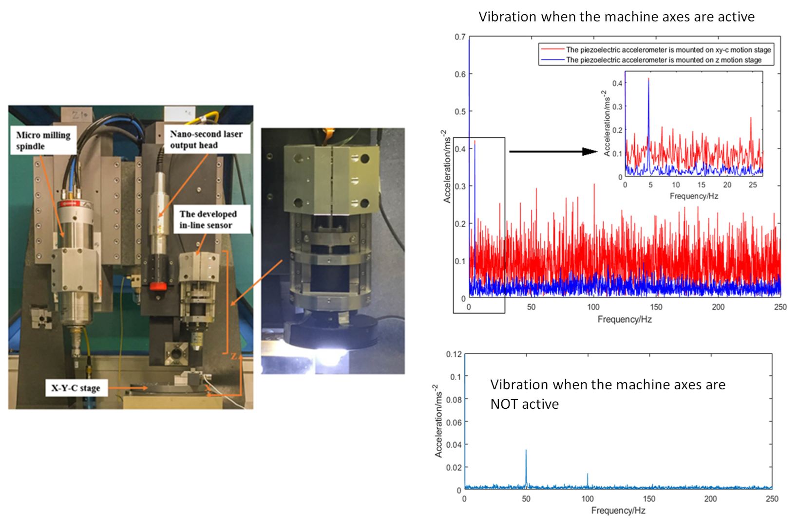 The vibration effect in this on-machine conditions is large. From figure 7 right, we can observe that when the machine axes move, the vibration becomes large.