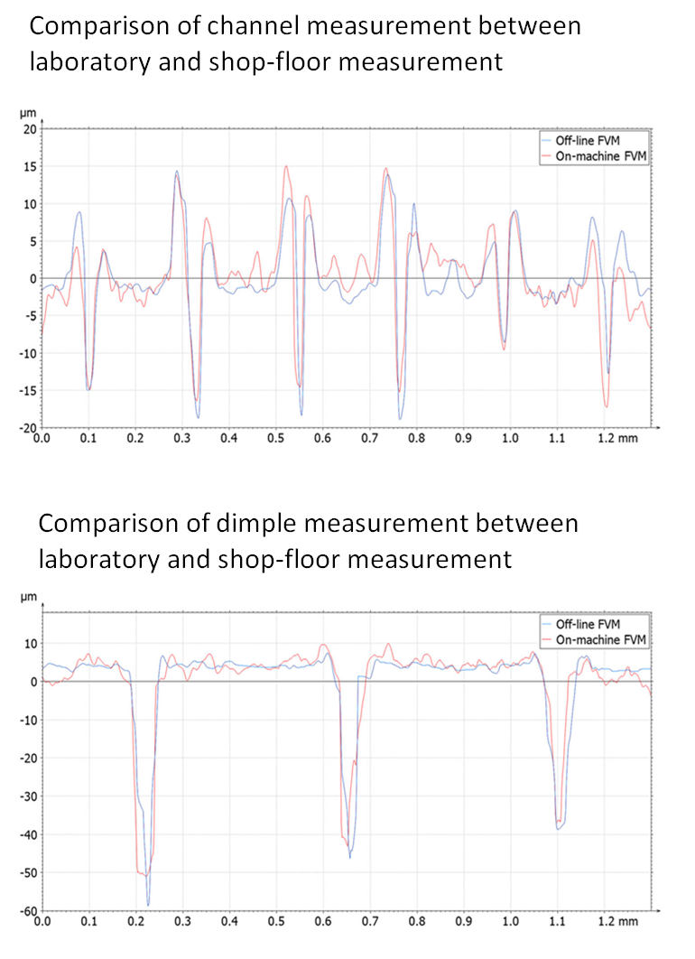 To understand the effect of the vibration on the measurement results of the on-machine measuring instrument, figure 8 below shows the head-to-head comparisons of channel and dimple measurements performed in two conditions: off-line (in a controlled laboratory) and on-machine (on a shop floor where vibrations are significant).