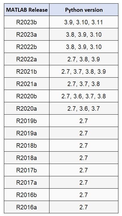 A detail list of Python versions that are compatible with MALTAB can be found here. Table 1 below shows the list of MATLAB-Python compatibility version.