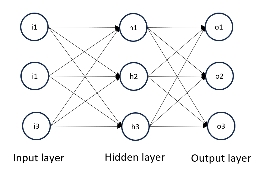 In figure 1, there are three layers on the NN: input, hidden and output layers. Each layer has three nodes.