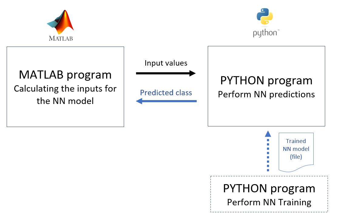 To summarise, the overall operation of the software system is then as follow (figure 3). The application (the MATLAB software) calculates input features. These input features are then sent to the Python software to perform NN predictions. The predicted class (given in the inputs) is then sent back to the application (the MATLAB software).