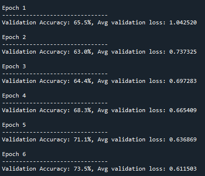 print(f"Validation Accuracy: {(100*correct):>0.1f}%, Avg validation loss: {test_loss:>8f} \n")