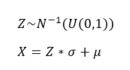 Where $Z$ is a random variable that is generated from $N^{-1}()$ which is the inverse of standard normal cumulative distribution, $U(0,1)$ is a random variable between 0 and 1 that is sampled from a uniform distribution, $\sigma $ is the standard deviation and $\mu$ is the average value, and $X$ is the generated random variable.