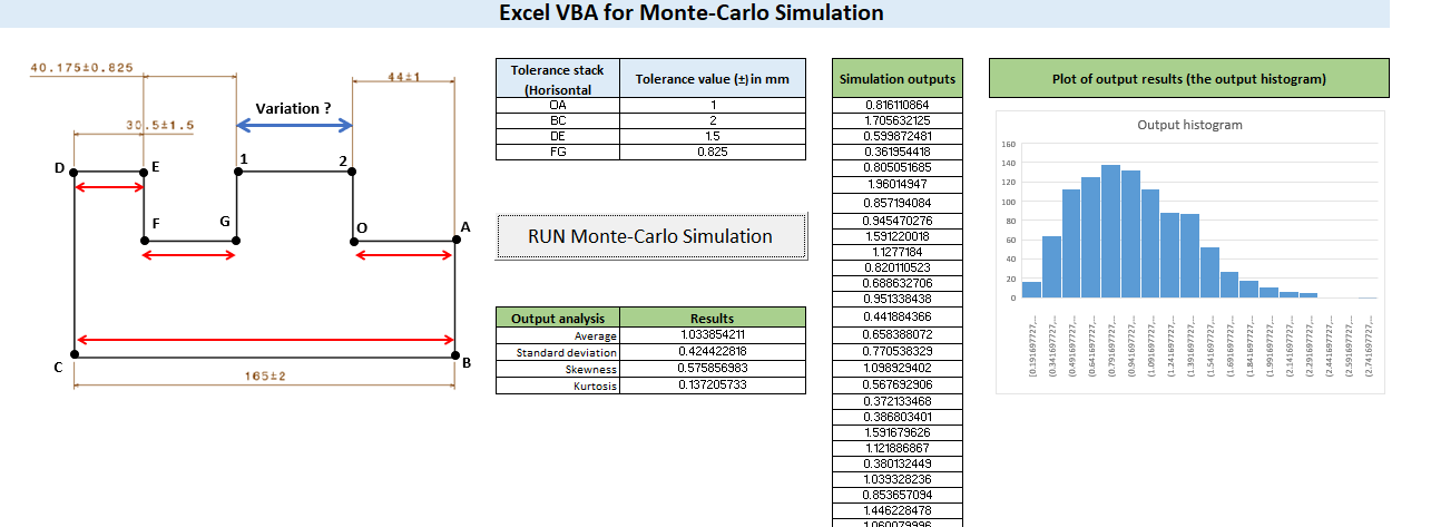Figure 1 above shows the final layout of the VBA macro applications in Microsoft Excel. The application will contain the picture of the part and its tolerance chain, a table of the tolerance values involved in the tolerance chain, a command button to run the MC simulation by running the VBA macro script, a table showing a statistical summary of the simulation, a table showing the output for each MC simulation iteration and a histogram plot of the MC simulation outputs.