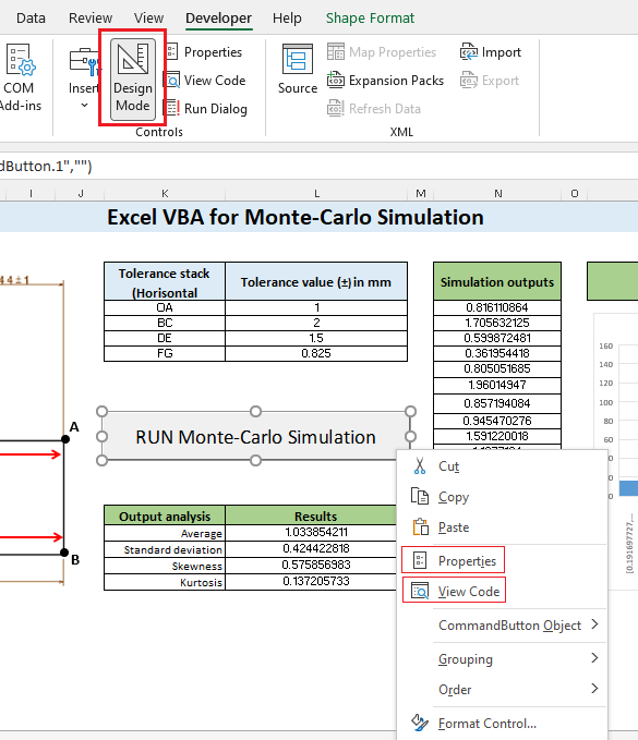 To set the properties and to add codes to program a task when the button is click by users (to run the MC simulations), we just need to right click the button (note: the “Design Mode” button should be active).