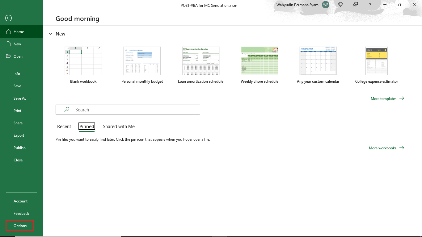 To show the developer ribbon, we can go to “file” and then press the “options” button.
