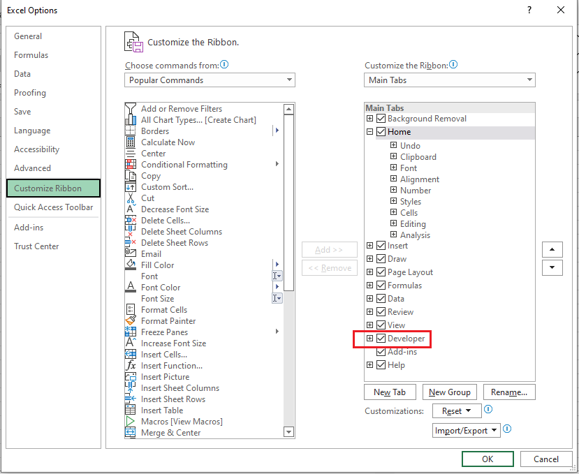 From this “excel options” window, press the “customized ribbon” buttons and check the “Developer” that belongs to the “Main Tabs”. Figure 5 shows the process to check the “Developer” ribbon option.