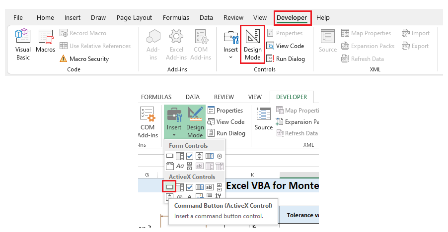 After we can activate the “Developer ribbon”, now we can start to design the Excel layout and add a command button for our MC simulation applications.
